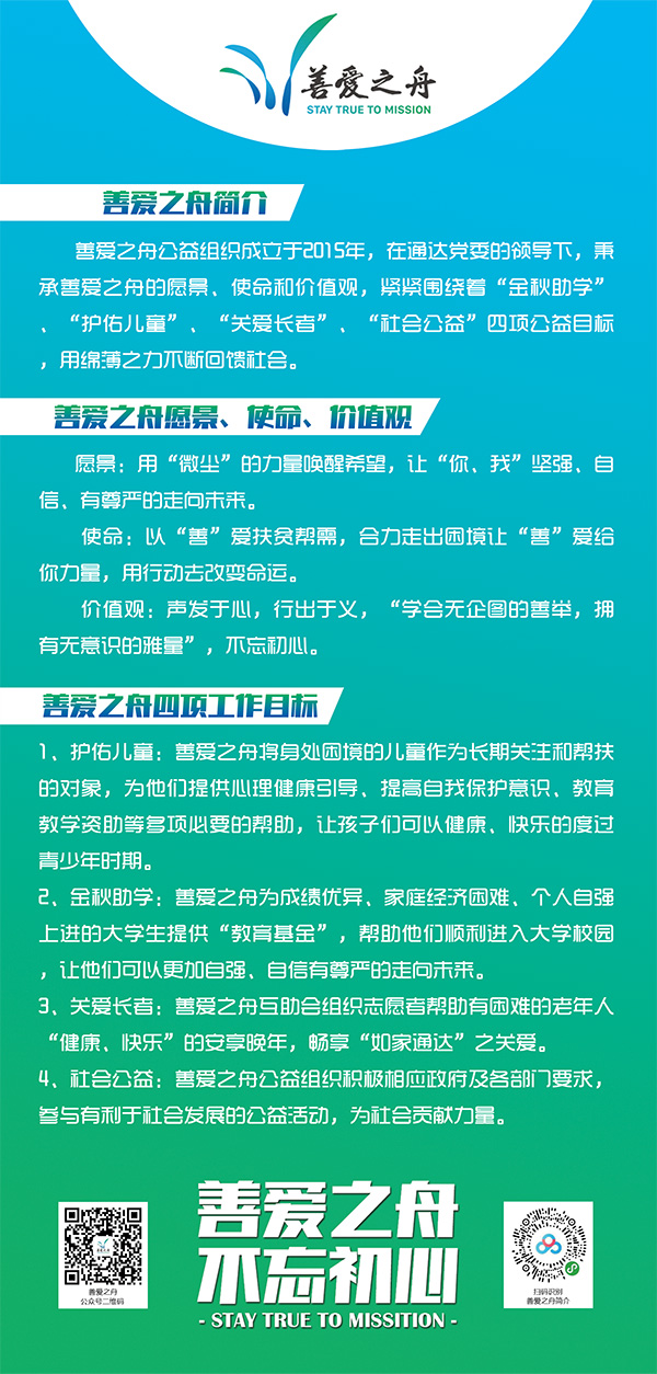 伴隨著2020年度高考的結(jié)束,關(guān)注貧困大學(xué)生,再度成為我們身邊的話題,以“善”愛(ài)扶貧幫需,合力走出困境,讓“善”愛(ài)給你力量,用行動(dòng)去改變命運(yùn),善愛(ài)之舟金秋圓夢(mèng)公益助學(xué)再次起航。