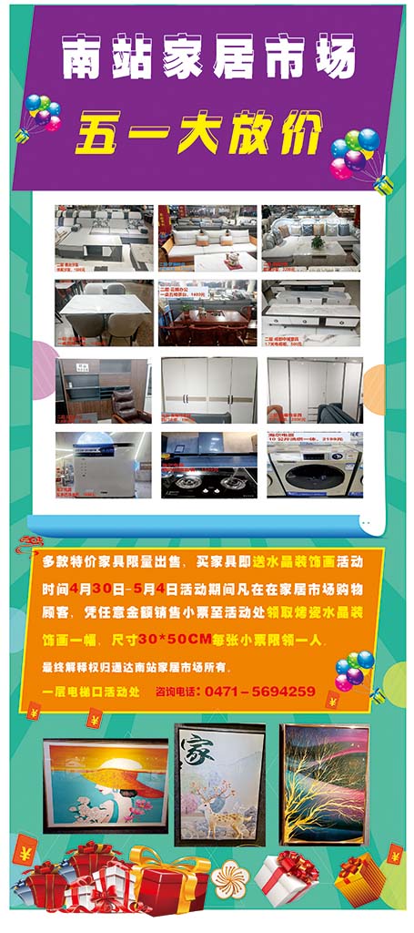 家居市場"五一大放價"營銷活動,配合節(jié)日活動營造節(jié)日氛圍,場外空飄條幅布置,家居市場戶外樹立了6顆空飄氣球,渲染了節(jié)日氣氛,廣而告之的宣傳手段,一定程度上提升了市場活動的社知曉度! 會 場內(nèi)買贈有禮活動火熱進行中。