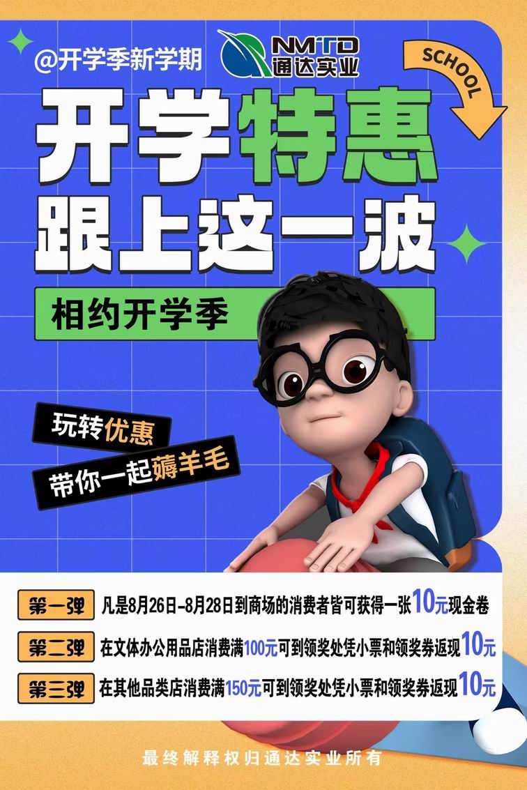 9月臨近,又迎來一年開學(xué)的日子。每一年的開學(xué),令眾多學(xué)子向往,充滿希翼和對未知的渴望,它開啟了童年、少年、青年的求知夢想,記錄了稚嫩、豆蔻、青蔥的歲月年華。8月底,通達商場推出開學(xué)季促銷活動,全商場特賣一降到底,新學(xué)期用品推出特價,為學(xué)子獻上開學(xué)大禮。