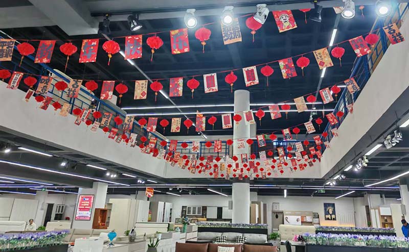 在氛圍布置上,南站市場聚焦兩大市場特點精準發(fā)力。家具市場以“溫馨整潔”為核心,暖色調(diào)彩燈纏繞于立柱與天井之間,天井懸掛的新年彩帶與紅燈籠縱橫交錯,搭配現(xiàn)代燈光,營造出溫馨雅致的購物氛圍。樓梯處的臺階貼滿產(chǎn)品指示地貼,從沙發(fā)、茶幾到全屋定制,清晰的分類指引與“選通達,更舒心”的標語,既方便消費者逛店,也傳遞出市場對商戶經(jīng)營的支持。市場入口的玻璃門上,“2026新年快樂”“馬年吉祥”等貼紙與紅色拉手相呼應,讓進門的顧客第一時間感受到節(jié)日氛圍。